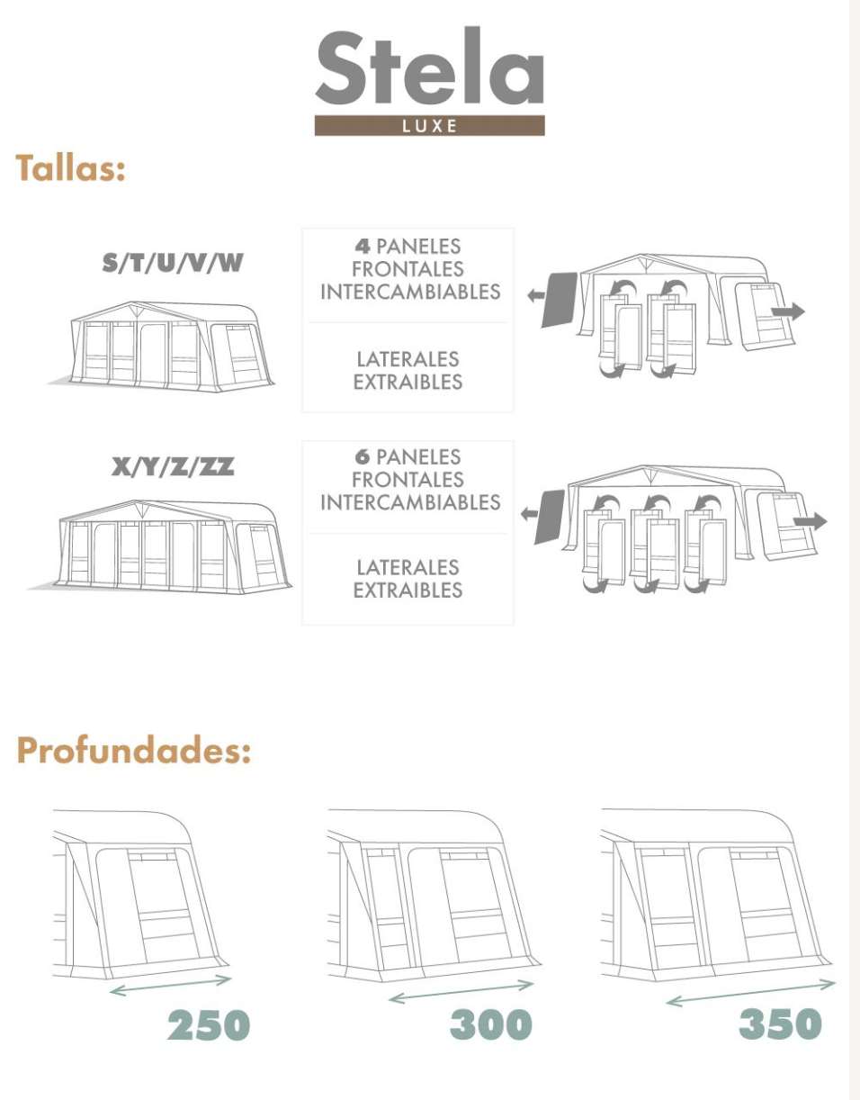 Disponible en tres versiones: estándar en 250 cm de profundidad y con espacio extra en 300 cm y en 350 cm. Se trata de un atractivo avance, con una elegante combinación de colores bitono de grises. Tanto el techo como los paneles son de material totalmente transpirable. El frontal se compone de 4/6 paneles, todos desmontables e intercambiables. 3/4 de ellos constan de ventanas fijas y de diseño liso, el otro/s posee una puerta desplazable hacia cualquier posición ofreciendo así todas las posibilidades de transformación. Cada lateral es desmontable y dispone de una puerta y de una ventana abatible con mosquitera. En los modelos 300 cm y 350 cm añadimos una ventana fija. Este modelo puede cerrarse completamente ya que dispone de tapas en las ventanas, también puede usarse como toldo parasol desmontando los paneles laterales y frontales. Opcionalmente se puede habilitar como balconera en frontal y laterales.